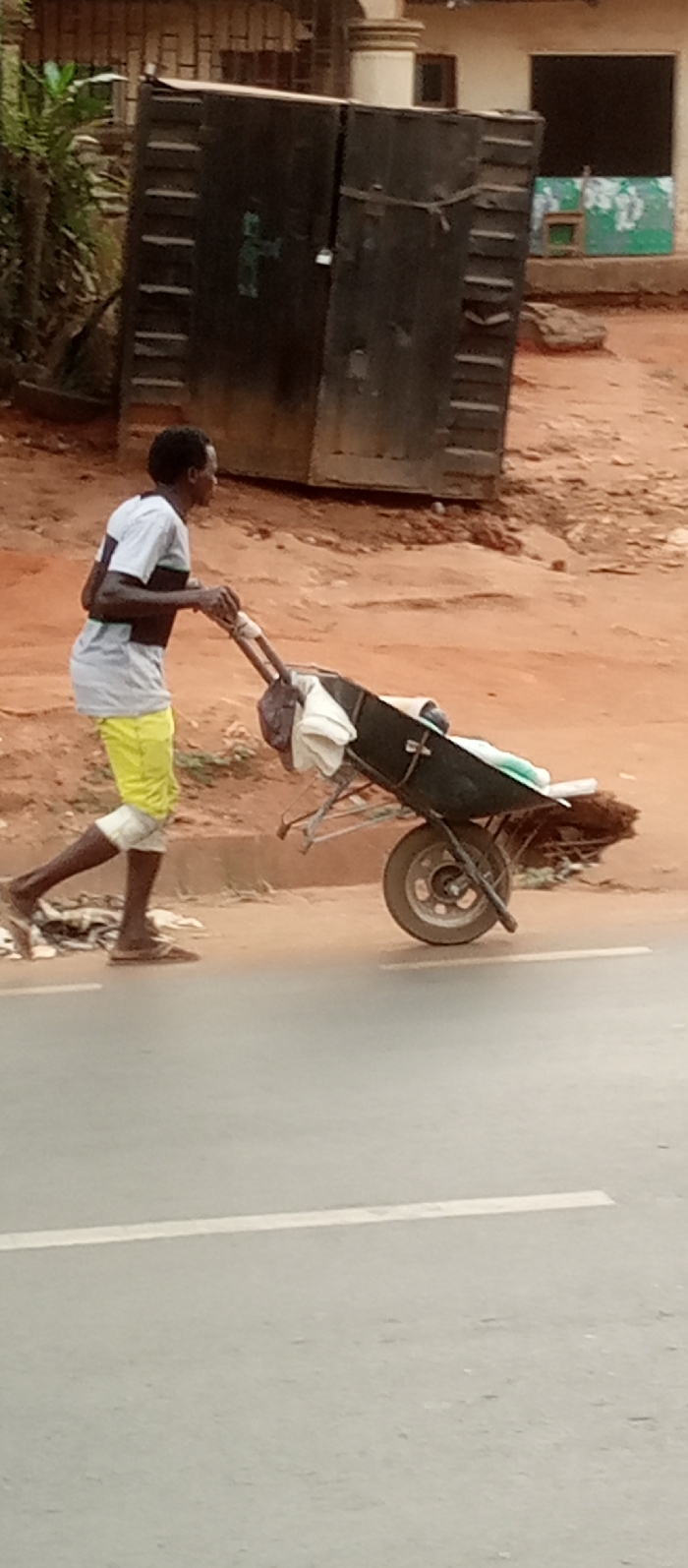 - "A dark-skinned person pushes a loaded wheelbarrow down a street in a rural setting" by FM-qZjH53, licensed under CC BY 4.0