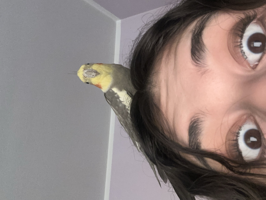 - "A close-up, low-angle photographic forensic image captures a cockatiel perched on a human head in an indoor setting within Stara Zagora, Bulgaria" by FM-7OTPa2, licensed under CC BY 4.0