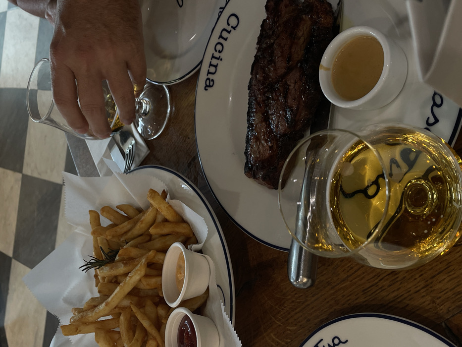A top-down shot showcases a restaurant meal. A steak sits on a plate with a sauce cup, next to a wine glass. A plate of fries with two condiment cups is also visible. Someone's hand holds a glass above the table. The plates have "Cucina" written on them in a circular pattern. The table appears to be wooden with a checkered floor visible in the background.