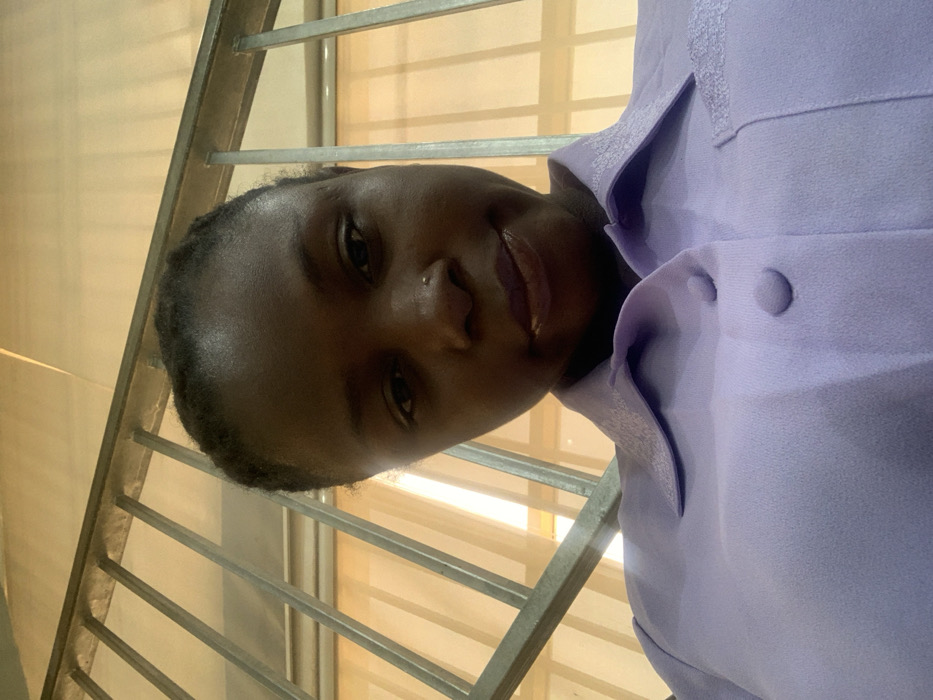 A close-up, upward-angled portrait features a dark-skinned female individual. She is wearing a light purple collared button-up shirt with two visible front buttons and a patterned detail on the collar and a left chest pocket. A small metallic stud piercing is present on her left nostril, and her lips are colored with a dark red/purple hue. Her hair is pulled back from her face. The background consists of a metallic railing with multiple vertical bars, positioned above and behind the subject, indicating an indoor or sheltered outdoor setting. Behind the railing, a light-colored surface, possibly a wall or window allowing diffuse light, is visible. The scene's specific location within the city of Arawa, Nigeria, is not discernible from the visual evidence.