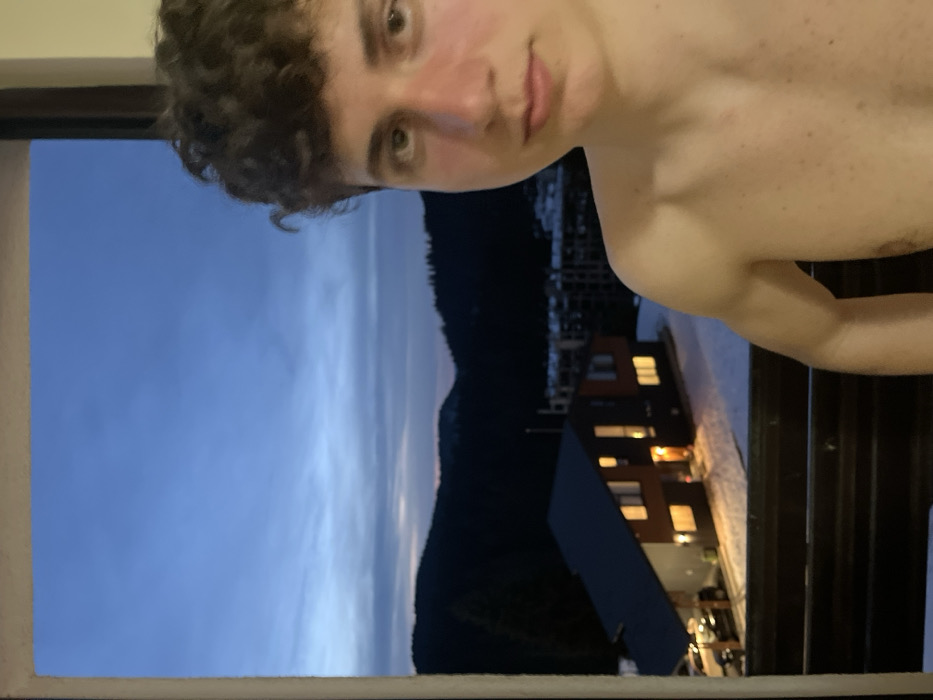 An indoor-to-outdoor, waist-up portrait captures a young male on the right, looking directly at the camera