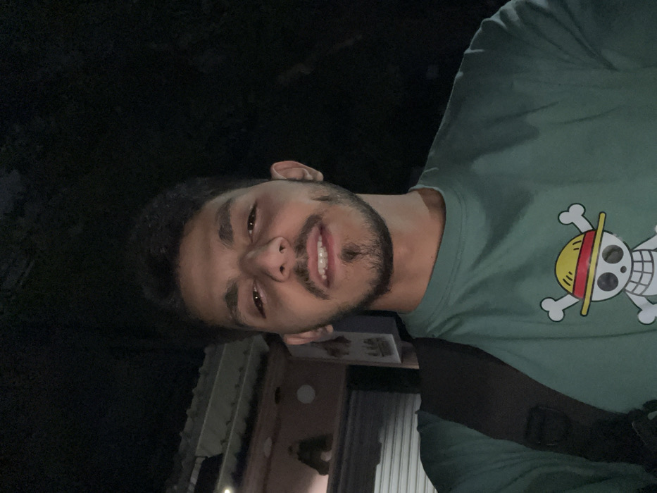 A young adult male, presumed to be in the As-Salihiya Municipality, Syria, is depicted in a close-up, dimly lit, frontal portrait taken at night. The subject has dark hair, a goatee, and stubble along his jawline, with prominent dimples on both cheeks. He is wearing a dark teal or green short-sleeved t-shirt featuring a "One Piece" Jolly Roger graphic, depicting a skull and crossbones adorned with a straw hat. A dark-colored backpack strap is visible over his left shoulder. He exhibits a slight smile, revealing his upper teeth, and is looking directly at the camera. The background, largely obscured by darkness, shows a portion of a building to the subject's left, identifiable by a corrugated metal roof, a closed storefront with a metallic rolling shutter, and an overhead light fixture. The overall scene suggests an urban or semi-urban outdoor setting illuminated by artificial light sources.