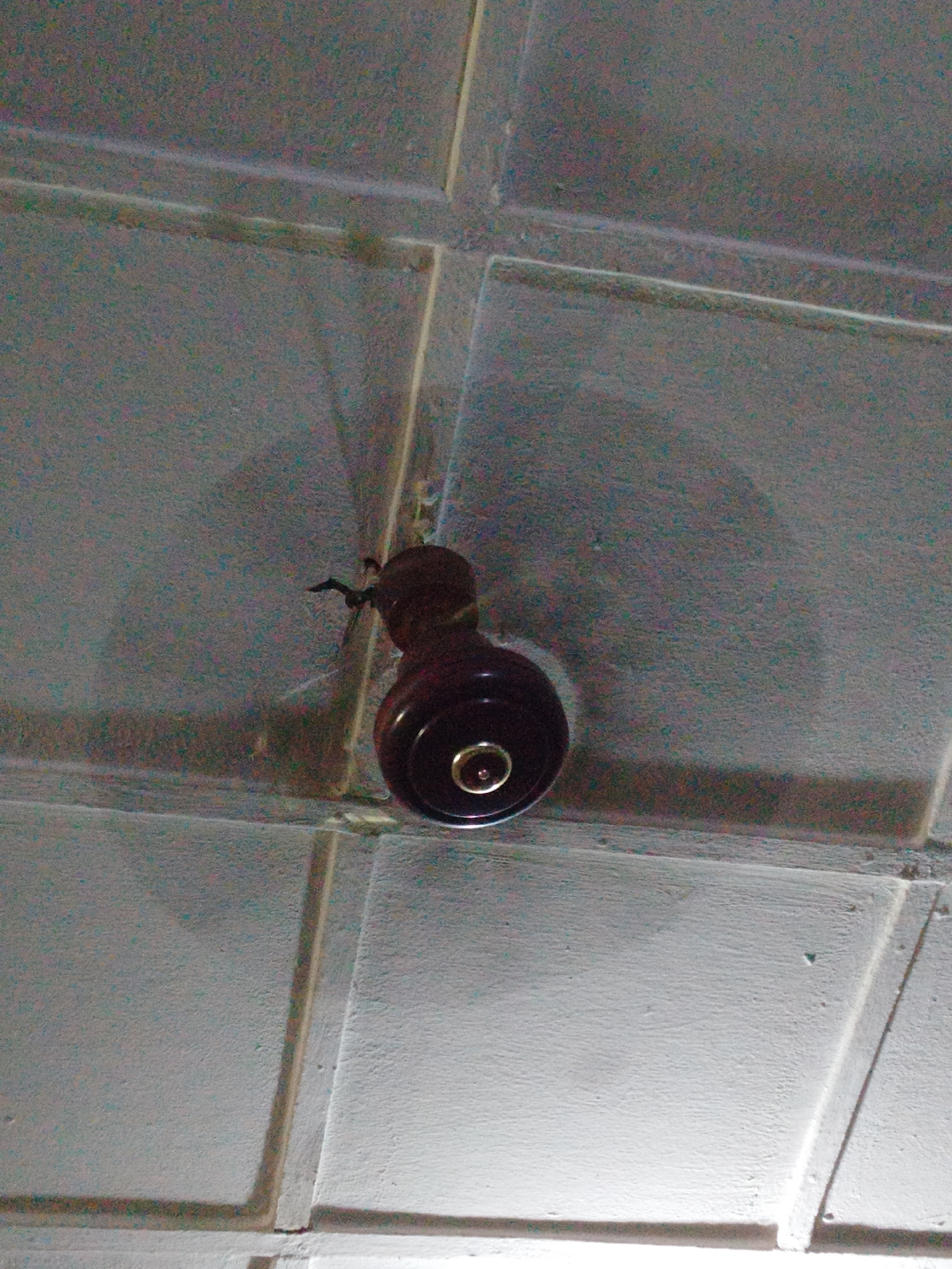 - "A dark brown ceiling fan is mounted on a textured, off-white ceiling composed of square or rectangular panels, separated by slightly recessed lines" by FM-yIzVQ2, licensed under CC BY 4.0