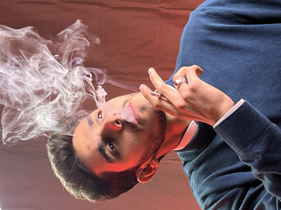 A man exhales cigarette smoke. He has dark hair, a trimmed beard, and is wearing a navy blue sweater over a white collared shirt. A silver ring with a red stone is visible on his right hand, which also holds the cigarette. The background is a reddish-brown hue with slight texture. The image is tilted, causing the man to appear on a diagonal axis. The lighting casts red tones on the man's face.
