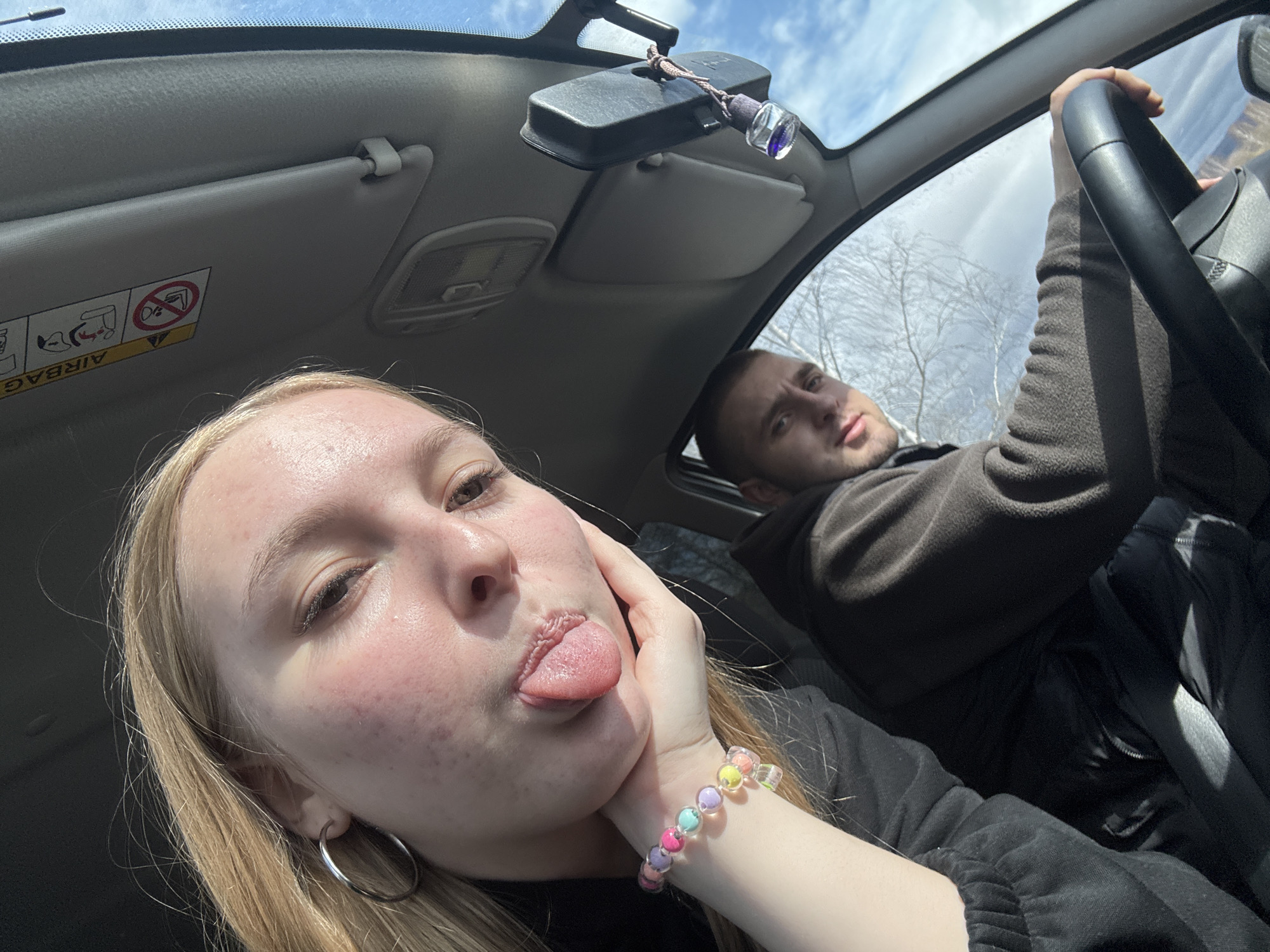 two people inside a car, likely a selfie taken by the person in the foreground. A young woman with blonde hair, wearing a black shirt, is sticking out her tongue. She is wearing a silver hoop earring and a beaded bracelet. Behind her, a man is driving the car. He is wearing a brown hooded sweatshirt. The car's interior is visible, including the rearview mirror, sun visor, and steering wheel. The environment seen through the windshield appears to be a partially cloudy sky and bare trees, suggesting it might be winter or early spring. The location of the photo is unknown, as there is no way to determine it from the image. Krylovo, Russia is not mentioned or visible.