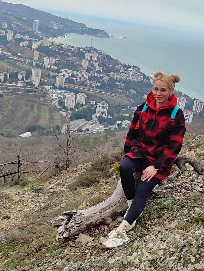 A blonde-haired female, styled with two top buns, is seated on a fallen, weathered log on a rocky, sparsely vegetated hillside. She faces forward, smiling, wearing a red hooded sweatshirt under a red and black plaid jacket, black leggings, and beige athletic shoes. A light blue backpack with orange straps is on her back. Her left hand, with light pink nail polish, rests on her left thigh, displaying a watch on her wrist. The scene is located on an elevated slope overlooking the city of Partenit, Ukraine, which stretches along the Black Sea coast. Numerous multi-story buildings, including a distinctive curved structure and various high-rises, are visible across the urban landscape. A communication tower stands on a headland near the sea. The Black Sea extends to the horizon under an overcast sky. The foreground terrain is characterized by loose rocks, dry brush, and bare tree branches.