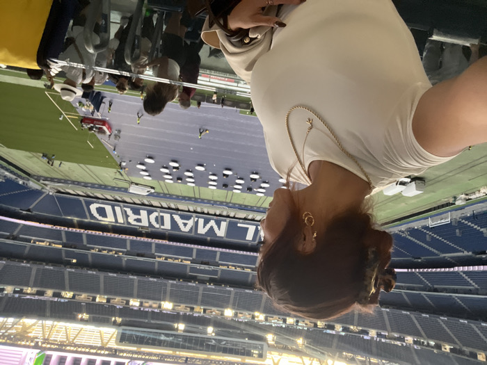 An elevated view within the Santiago Bernabéu Stadium in Madrid, Spain, is captured. The stadium's blue tiered seating is visible, with the word "MADRID" spelled out in white lettering across a section of the upper stands. In the foreground, a woman with dark hair styled in a bun with a leopard print claw clip, wearing a light-colored short-sleeved top, a gold rope chain necklace with a 'K' pendant, and gold hoop earrings, looks down towards the field. Her left hand holds a dark bag or jacket. The stadium field below is partially covered by a dark tarp, upon which approximately thirty-five small, white, round tables are systematically arranged in rows. A section of green grass is visible on the right side of the field. Two white vans are parked on the covered area near the left sideline. Several small figures, identified as workers, are engaged in activities on the field, with some near red and blue structures on the right side. A small group of spectators is visible in the lower seating area to the right, one individual wearing a white fedora hat. Artificial lighting illuminates the stadium interior from above.