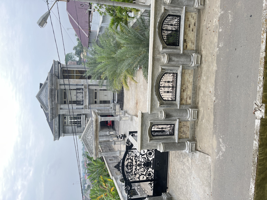 The image depicts a large, two-story residential property located in Lhokseumawe, Indonesia, under an overcast sky. The house exhibits an ornate, neoclassical architectural style with a predominantly grey exterior, featuring prominent columns, balustrades on second-story balconies with black wrought-iron railings, and decorative cornices. A central covered portico, supported by columns, extends over a driveway leading to a carport where a red car is partially visible. A white scooter is parked near the carport's entrance. The property is secured by a robust perimeter wall, also grey, adorned with decorative pilasters and arched sections fitted with black wrought-iron grilles. The lower portion of this wall is faced with light brown, patterned tiles or brickwork. The main entrance features a large, double-leaf black wrought-iron gate with intricate scrollwork. The front yard is paved with concrete, and a mature palm tree with green fronds is prominent on the right side of the property, partially obscuring the house. A paved asphalt street runs across the foreground, separated by a low concrete structure. In the background, beyond the immediate property, other residential buildings with reddish-brown tiled roofs and dense tropical vegetation, including banana trees, are visible. Overhead utility lines are strung across the upper portion of the frame, attached to a utility pole fitted with a street light on the far right. No individuals, discernible actions, or interactions are present in the scene.
