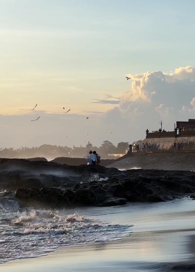 A beachside scene unfolds as waves crash against black rocks, creating a splash. Two figures are sitting on the rocks, seemingly looking out at the sea. Several kites dot the sky, while a building stands on a wall in the background, where a group of people are gathered. The sky above is partly cloudy with a warm hue indicating sunset.