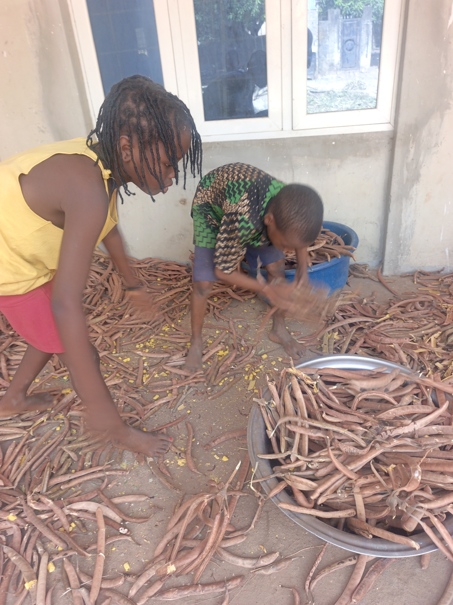 Two children are shelling beans outside a building with a window in an unknown location. The child on the left is wearing a yellow sleeveless shirt and red shorts, while the child on the right is wearing a patterned short-sleeved shirt and blue shorts. Both are barefoot and appear to be working together to shell the beans. Brown bean pods are scattered on the ground and piled in a silver basin in the foreground and a blue bucket in the background. Yellow beans are scattered on the ground.