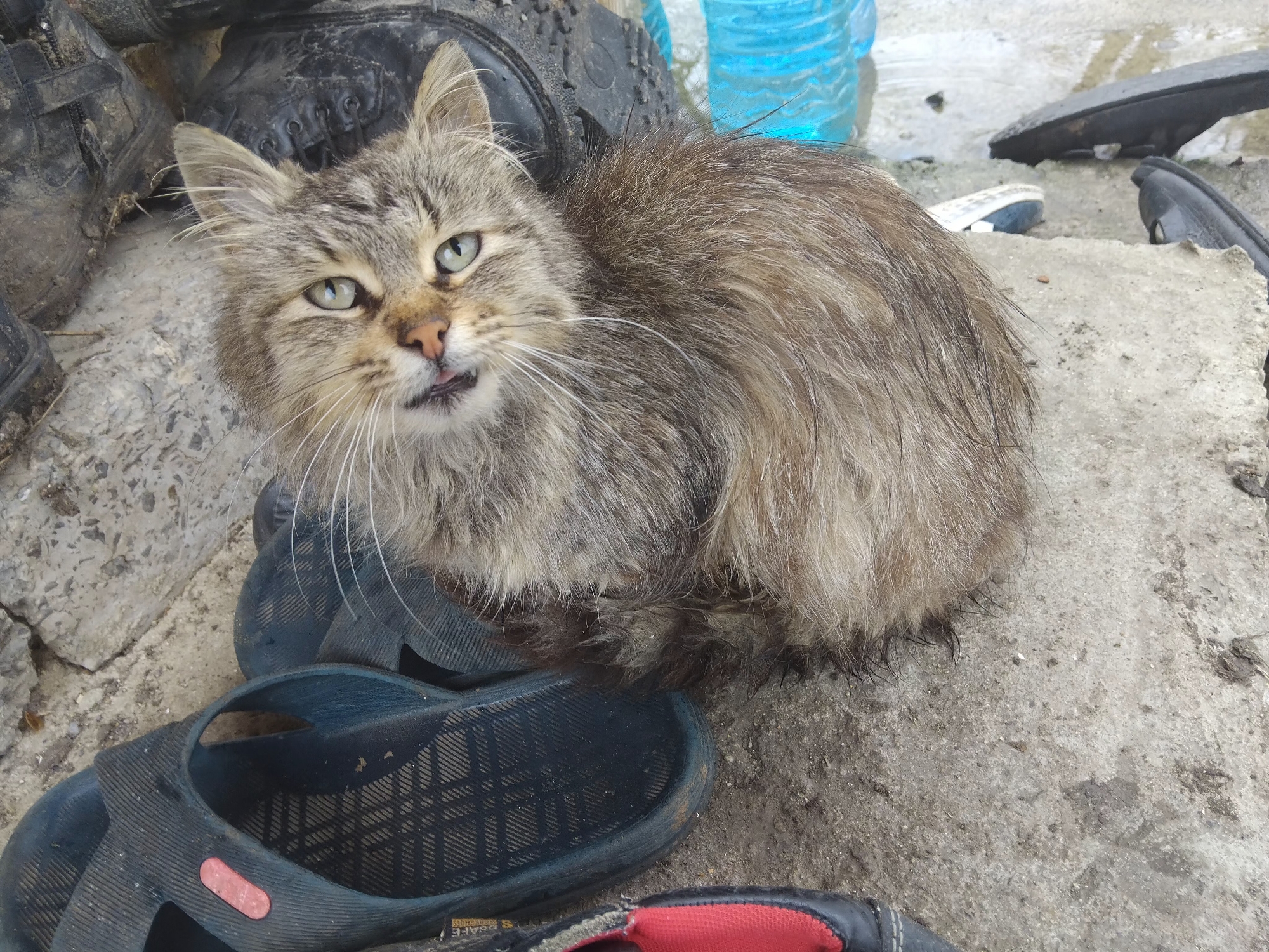 A gray tabby cat sits on a concrete surface in Kameno, Bulgaria. Beneath the cat are a pair of blue flip-flops. To the left, there are black boots, and to the right, a blue plastic water bottle and various pieces of discarded rubber and plastic. The concrete is stained and dirty.