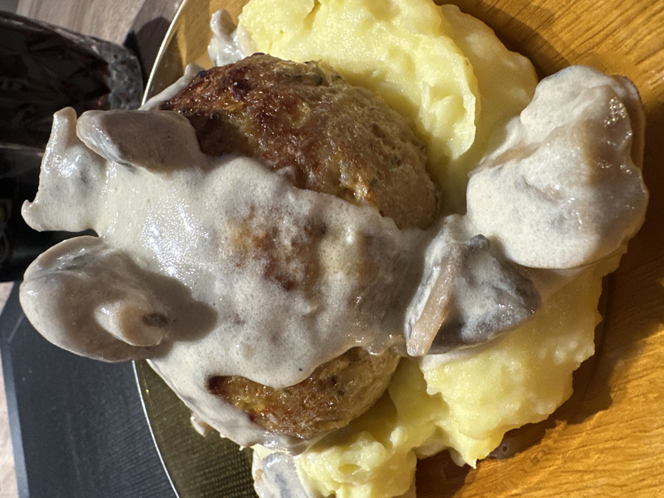 The scene depicts a prepared meal presented on a round plate with a golden-metallic rim and a visible wood-grain textured base. The location is an indoor setting in Weißenburg in Bayern, Germany. The central subject is a large, pan-fried or baked ground meat patty, deeply browned on its visible sides, copiously covered with a creamy, light-beige mushroom sauce. Multiple dark-capped mushroom slices are embedded within and resting atop the sauce. The patty is positioned on a generous portion of pale-yellow mashed potatoes. In the blurred upper right background, a dark, patterned glass containing a dark liquid is partially visible. The surrounding environment consists of dark, indistinct surfaces, likely a tabletop and background elements. No individuals are present, and no actions are occurring beyond the static presentation of the food.
