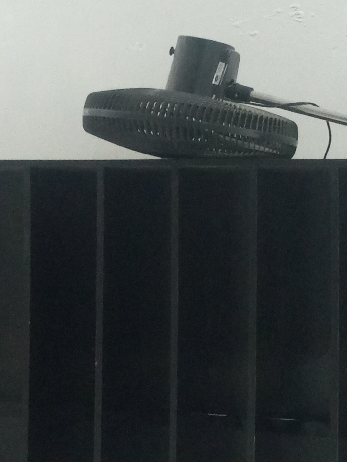 A black fan sits atop a dark, vertically-paneled piece of furniture