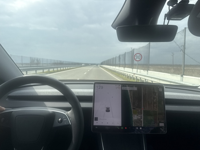 An interior view from a Tesla vehicle shows a driver's left hand on the steering wheel while traveling on a multi-lane highway near Aheloy, Bulgaria