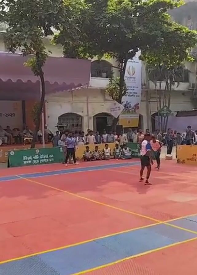 kabaddi match in progress on a red mat, in what looks like an outdoor arena