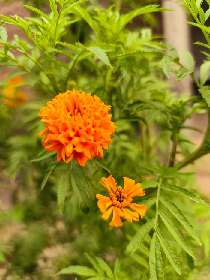 The image displays a close-up outdoor scene featuring two orange marigold flowers amidst vibrant green foliage. The primary subject is a large, fully bloomed, densely petaled orange marigold flower positioned in the upper-center of the frame. Below and to the right, a second, smaller marigold flower, exhibiting a lighter orange hue and a less developed, more open petal structure, is present. The flowers are surrounded by and emerge from a dense network of bright green leaves, which feature distinct serrated edges. The background consists predominantly of blurred green foliage, with a subtle, out-of-focus, light-colored element, possibly a wall or structure, visible in the upper-right. The scene depicts natural plant life in Teumpokteungku, Indonesia.
