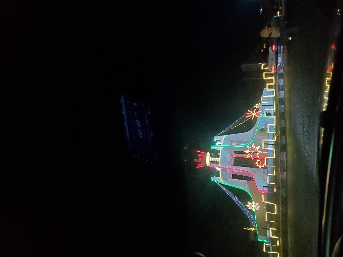 An illuminated structure, possibly a gate or tower, stands in the dark. The structure is adorned with vibrant Christmas lights in red, green, and yellow. The lighting forms star shapes, linear patterns, and a curtain of small lights. To the left, a dark object with faint text ("DE ROT") is visible. The background is predominantly black, suggesting a night scene.
