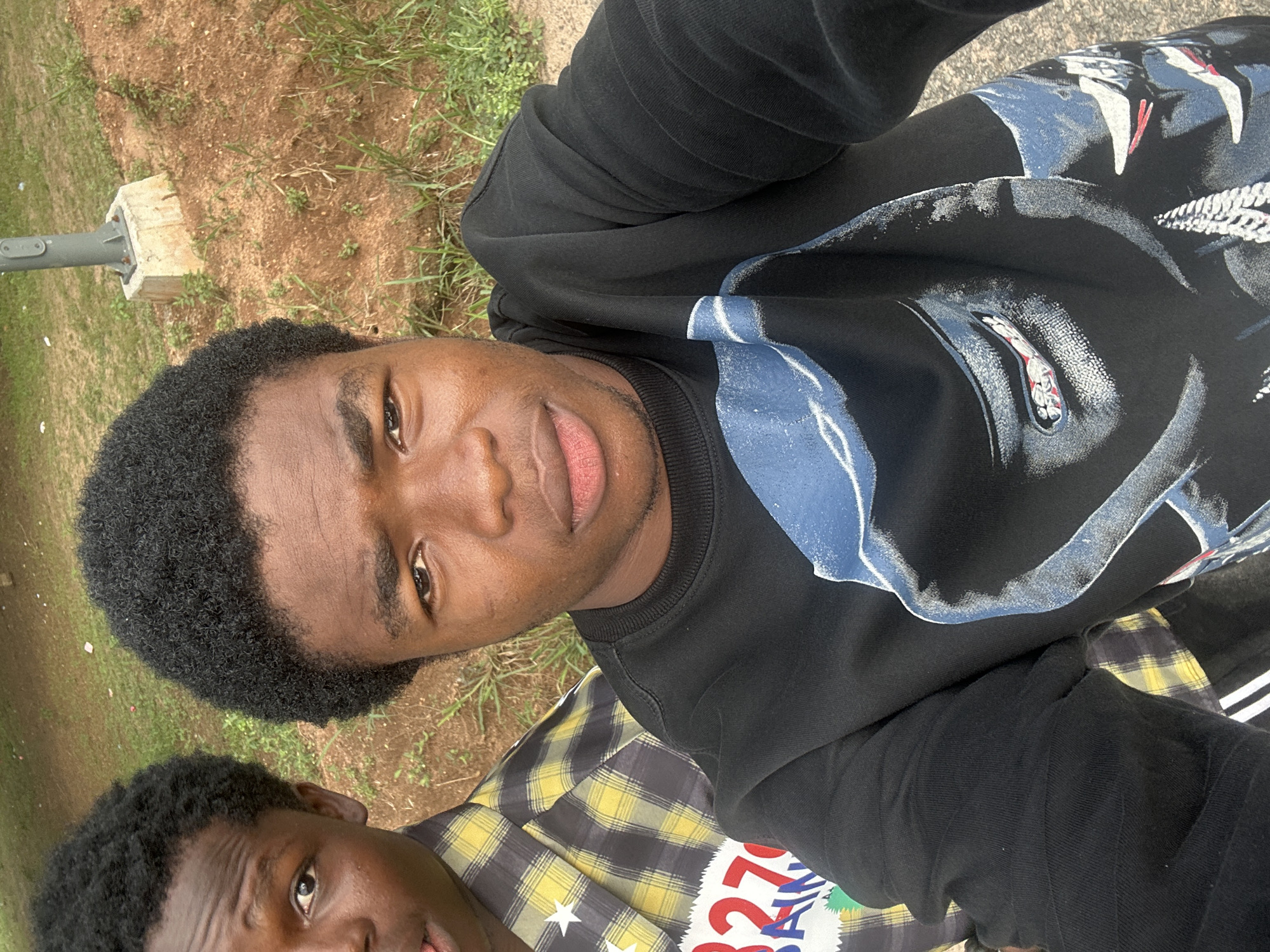 Two young black men are in the frame. One is closer to the camera. He wears a black sweatshirt with an abstract design and is partially in focus. The other man is partially visible in the bottom left corner, wearing a yellow and black plaid shirt with a logo that includes the number 327. They are outdoors, seemingly on or near grassy ground and what appears to be a paved area. A pole with a concrete base is visible on the left of the frame in the background. The location is Ihiagwa, Nigeria.