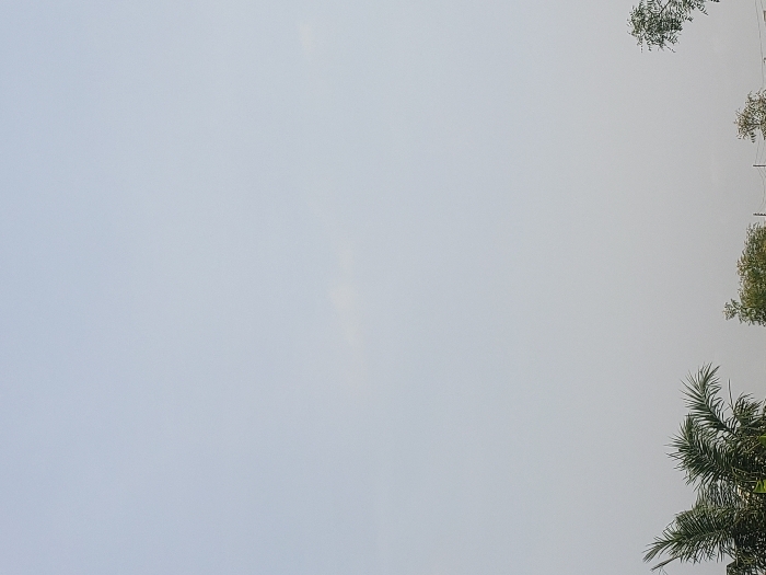 The image displays an outdoor scene in Adonkolo, Nigeria. The upper approximately 85% of the frame is dominated by a pale, hazy blue-grey sky, exhibiting minimal cloud cover. The lower approximately 15% features the upper sections of various green tree canopies. On the left side, dense, dark green palm-like fronds are visible. Towards the center and right, lighter green deciduous tree foliage is present. Faint horizontal linear structures, consistent with utility wires, are barely discernible against the hazy sky just above the tree line. No people, specific subjects, actions, or interactions are visible within the frame.