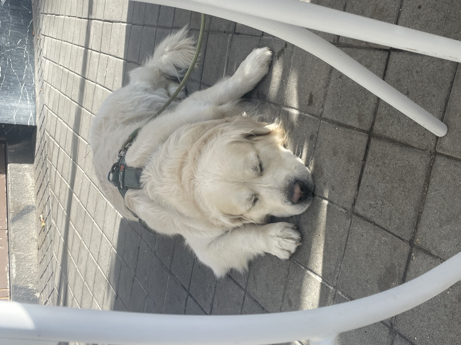 - "A cream-colored Golden Retriever dog is depicted lying prone on a grey paved sidewalk or patio in Madrid, Spain" by FM-5akHm1, licensed under CC BY 4.0