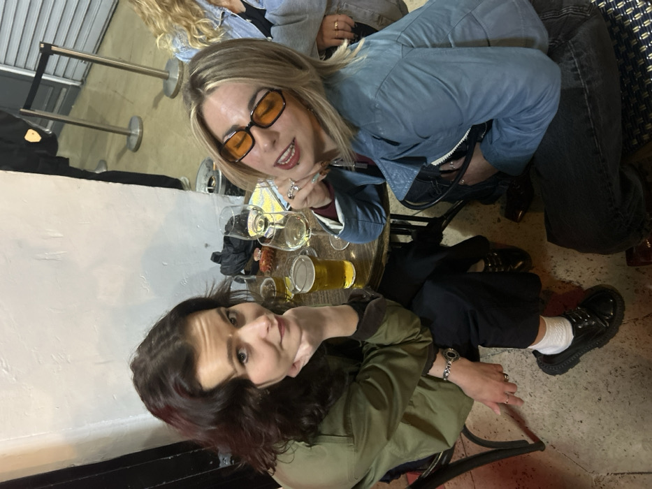 Two young adult females are depicted seated at a round table in what appears to be a bar or cafe in Paris, France. The female on the left, with dark wavy hair, wears an olive-green jacket, dark trousers, and black chunky-soled shoes with white socks, resting her chin on her left hand and looking directly at the camera. She wears a silver watch on her left wrist and rings on her left hand. The female on the right, with shoulder-length blonde hair, wears orange-tinted rectangular sunglasses, a light blue puffy jacket, and dark jeans, leaning forward with a slight smile. She wears multiple rings on her right hand. The dark wooden table contains two glasses of beer, two stemmed glasses of white wine, and an additional empty glass. Also on the table are a small reddish object, a yellow item (possibly a phone or small book), and a black folded item. In the background, a person is partially visible standing near silver crowd control stanchions with retractable belts. Another person with blonde hair is partially visible to the far right. The environment features a light-colored, possibly painted, wall behind the subjects and a stone or concrete floor.