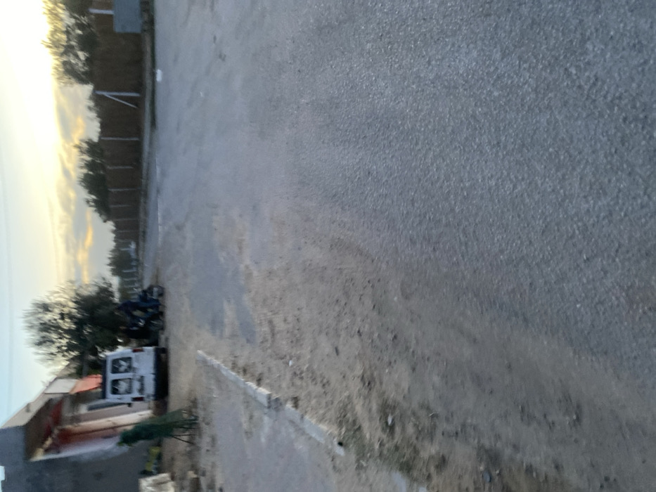A horizontal outdoor view captures a street scene under a bright sky. A gray asphalt road stretches across the upper portion. A white van is parked near a building. Green vegetation surrounds the building, with bare trees behind. A fence runs along the left edge of the road. The overall color palette is dominated by neutral tones, creating a muted ambiance.