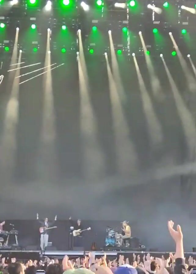A band performs on an outdoor stage in front of a large audience. The stage is equipped with a complex lighting system emitting bright white and green beams. Behind the band is a large screen displaying graphics and close-up shots of the band members. The band consists of five musicians, playing instruments including keyboards, guitars, and drums. The drummer is shown close-up on the screen. The audience is partially visible at the bottom of the frame, many holding up their phones. The stage structure includes scaffolding and speakers.