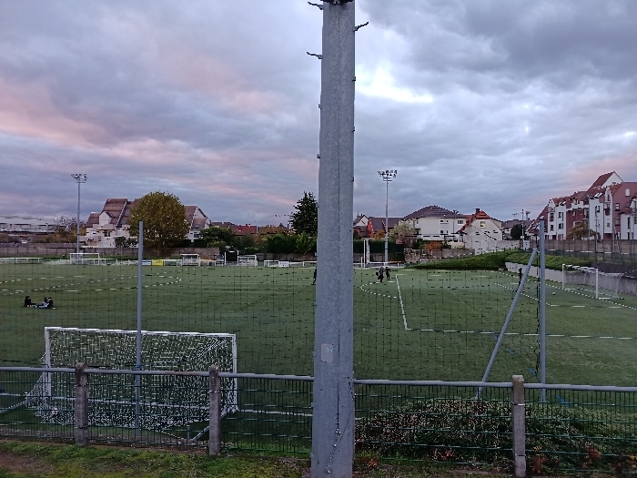 The image captures an artificial turf football pitch located in Bischheim, France, viewed through a wire mesh fence and a prominent grey metallic pole in the foreground