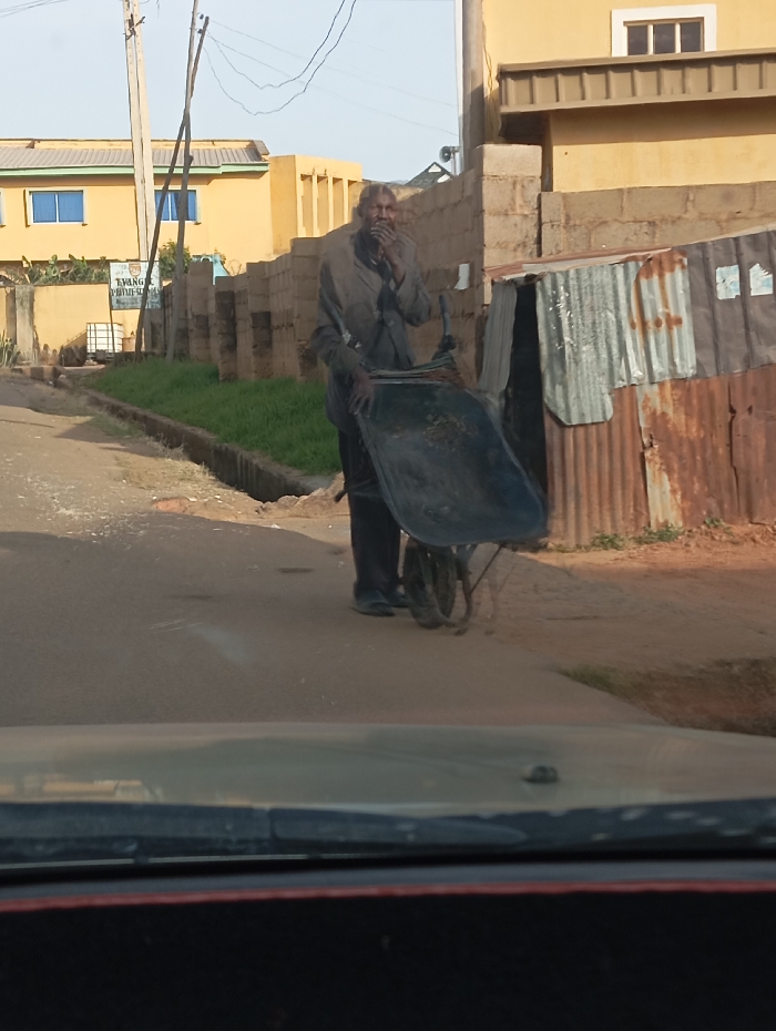 An elderly man wearing a grey suit pushes a wheelbarrow along a paved road. He is captured at eye level, appearing to be taking a break, with his hand near his mouth. In the background are yellow buildings, a low wall with greenery, and a makeshift corrugated iron structure. The image seems to be taken from inside a vehicle, with the dashboard visible at the bottom.