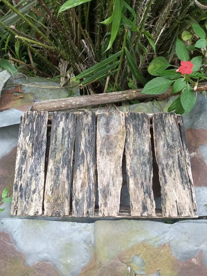 This image depicts an outdoor scene in Naya Andura, India. In the foreground, a multi-toned paved or tiled surface, exhibiting grey, brown, and green hues, is visible. Resting on this surface is a weathered structure composed of six vertically aligned wooden planks, varying in width and length, displaying dark grey and light brown tones indicative of age and exposure. Small nails are visible along the bottom edge of these planks. Behind the planks, a horizontal wooden beam or branch is positioned above a collection of rusted and damaged corrugated metal sheets and other debris. The background consists of dense green vegetation, including thorny stems, broad leaves, and a single red flower with five petals, likely an impatiens species. No individuals or active subjects are present.