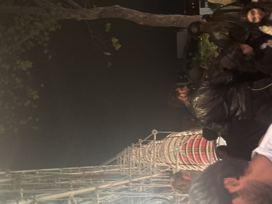 The image depicts a nighttime scene outside the Centre Pompidou in Paris, France, identifiable by its distinctive external framework and visible "caterpillar" escalator element, which shows internal red lighting. The sky is dark and featureless. A large tree trunk with sparse foliage is present on the right side of the frame. In the foreground and midground, a group of individuals is observed. A man with dark hair and a beard, wearing a white shirt, is partially visible in the lower-left corner. Another man with dark hair and a beard, wearing a black leather jacket, is seen from the back and side in the mid-center. Additional obscured and out-of-focus figures, including women and children, populate the scene, standing amidst the illuminated environment. No specific actions or interactions are clearly discernible among the individuals, who appear to be congregating.