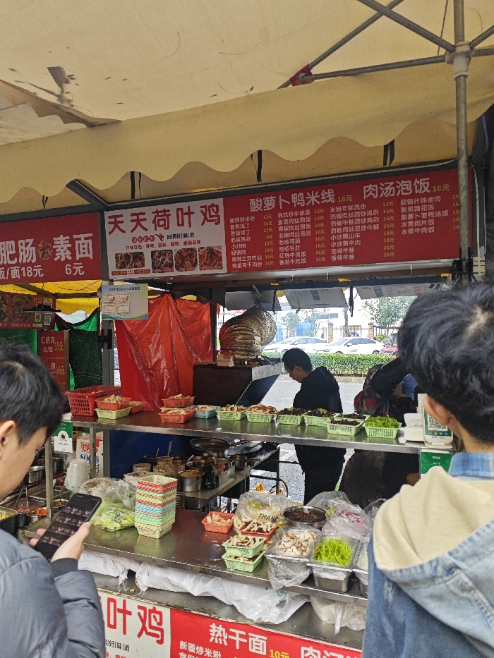 This is a food stall with a yellow awning, likely in China. The stall has a red sign with the name "天天荷叶鸡" (Everyday Lotus Leaf Chicken) and other menu items, including "酸萝卜鸭米线" (Sour Radish Duck Rice Noodles) and "肉汤泡饭" (Meat Soup Rice). Prices are listed in yuan. Various food items are displayed in small plastic baskets on a stainless steel counter, and a person is preparing food behind the counter. Two people are in the foreground, one looking at their phone and another turned toward the stall.