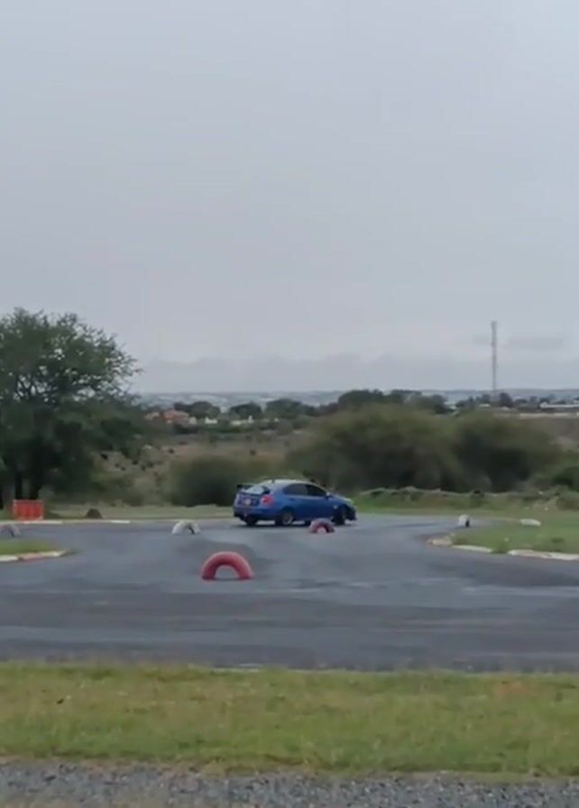 A blue Subaru Impreza performs a donut on a small wet asphalt track lined with semi-buried red car tires in an otherwise green grassy area