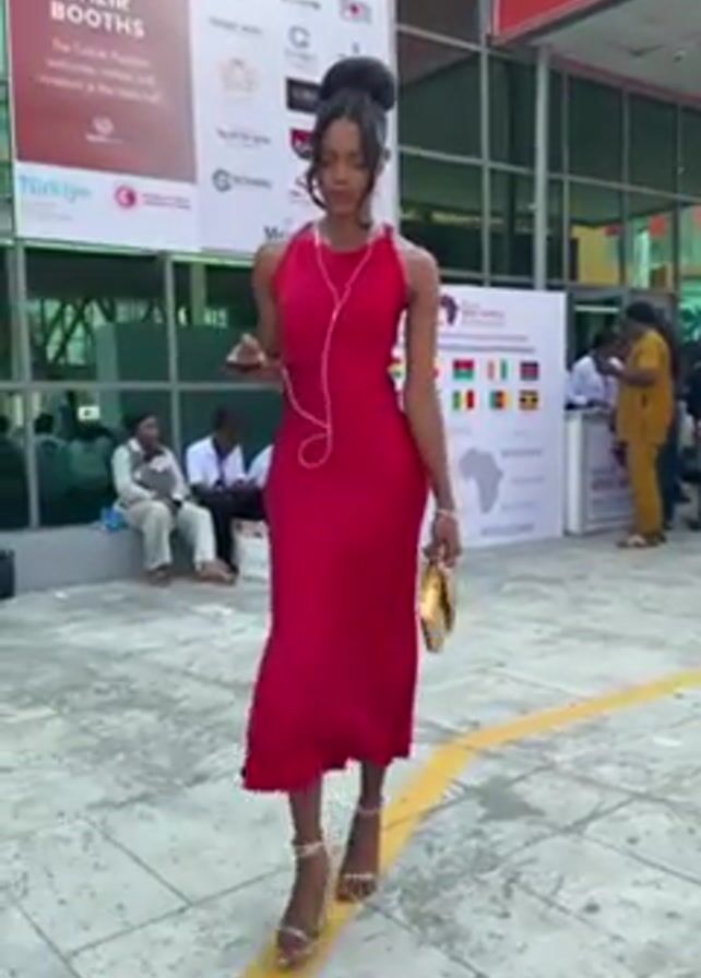 woman in a red dress and gold heels walking outside a building. She has a gold clutch purse in her left hand, and a cell phone in her right. She pauses, turning slightly toward the camera, and smiles. Behind her, there are people sitting and standing in front of a sign that reads "West Africa" with maps and flags of several countries. There is another sign that says "Explore the leading companies of Turkiye at their booths". Behind the woman is a building with mirrored windows and a black SUV. The ground is paved with interlocking concrete pavers.