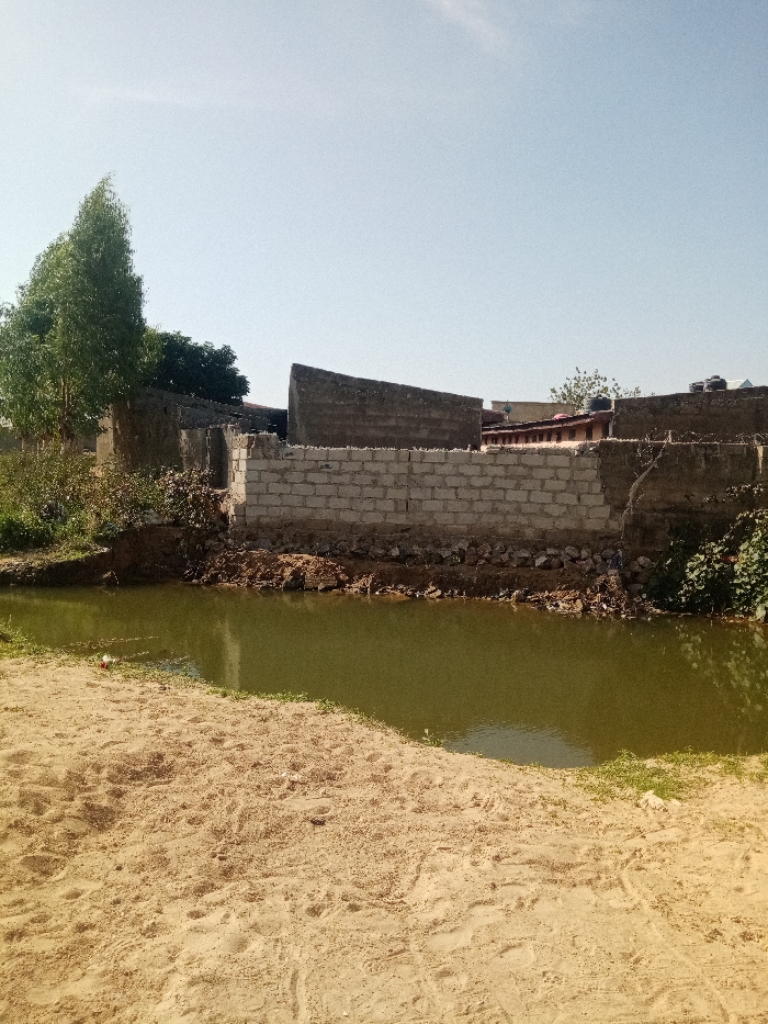 The image displays an outdoor scene in Dabawa, Nigeria, under a clear, light blue sky. In the foreground, a light brown sandy area with numerous footprints extends to a body of dark green, stagnant water. Directly opposite, beyond the water, a retaining wall constructed from unplastered concrete blocks is visible, showing signs of incomplete construction or erosion at its base. Behind this wall, various structures are present: an incomplete concrete building with bare block walls on the left, followed by what appears to be a more complete building with a reddish-brown roof and multiple dark objects (possibly water tanks) on its flat roofline towards the right. Lush green vegetation, including a tall, slender tree, borders the left side of the scene, while sparse green foliage is present along the water's edge on both banks. No individuals are visible.