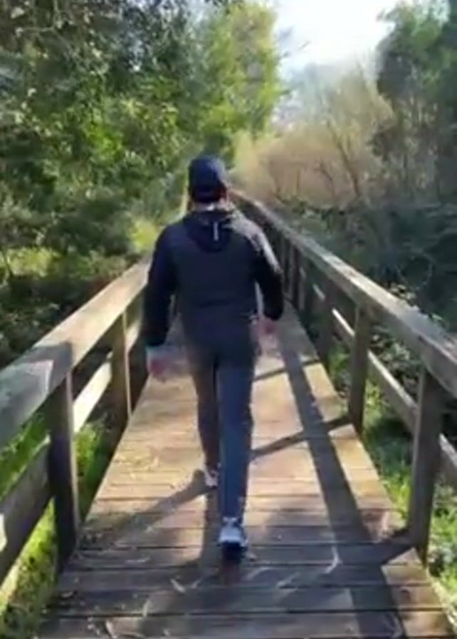 A man walks away from the viewer along a wooden bridge with railings. The man is wearing a dark jacket with a hood, dark pants, a baseball cap, and white sneakers. The bridge is surrounded by trees and brush. The weather is sunny.
