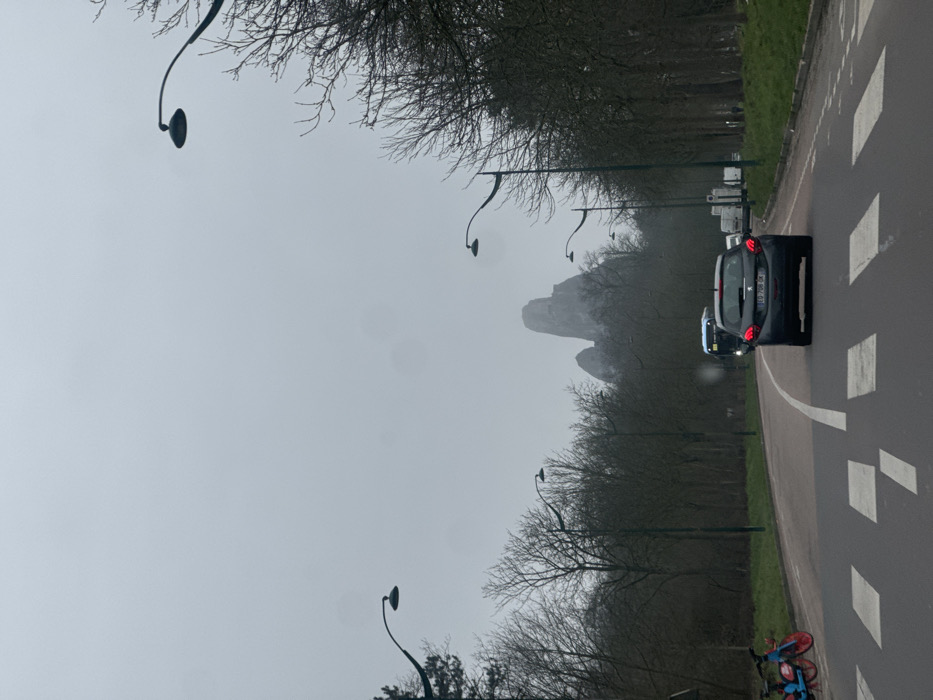 The scene depicts an overcast, hazy day on a road within the Bois de Vincennes, bordering Saint-Mandé, France