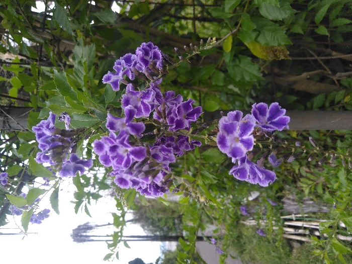 - "The image displays a close-up of a cluster of vibrant purple flowers with distinct white centers, identified as Duranta erecta" by FM-1kJrA2, licensed under CC BY 4.0