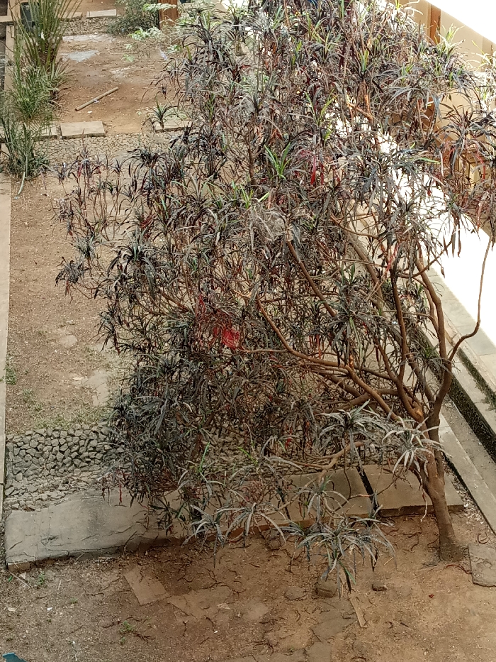 The image depicts an outdoor, unpopulated area, identified as Unknown, Unknown. A large, multi-stemmed shrub or small tree with dark, elongated leaves, exhibiting some reddish and green hues, dominates the central and right foreground. Embedded within its foliage, approximately midway up on the left side, is a small, crumpled red object. Higher in the canopy, a white, fibrous mass, possibly a spiderweb or cocoon, is visible. The ground cover consists primarily of exposed brown earth with sparse, light green vegetation. Along the left perimeter, a narrow concrete strip borders the dirt, beyond which are clumps of tall, spiky green plants. Two square, light-colored stepping stones are visible further back on the left, with a light-colored, elongated object lying on the bare ground between them. On the right side, a low concrete curb or wall runs parallel to the main shrub's base. The background shows indistinct light-colored structures. No individuals or active events are present in the scene.