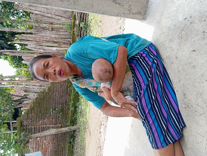 An adult female, appearing of Southeast Asian ethnicity, is seated on a light gray concrete surface in the city of Waung, Indonesia