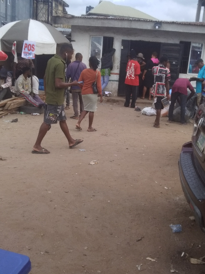 The image depicts a bustling outdoor scene in a commercial area of Ihiagwa, Nigeria