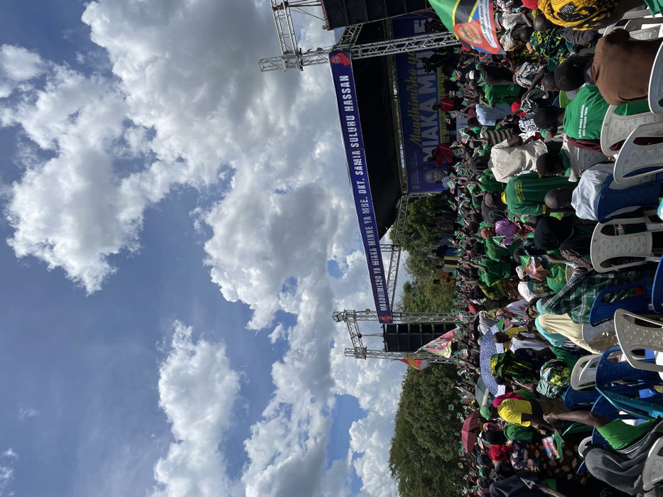 large crowd of people gathered in an outdoor space in Bariadi, Tanzania (latitude: -2