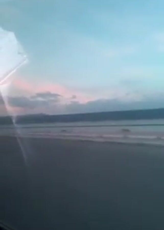 The view from a moving vehicle shows a grey road in the foreground and a body of water in the middle ground under a blue sky with pink tinged clouds