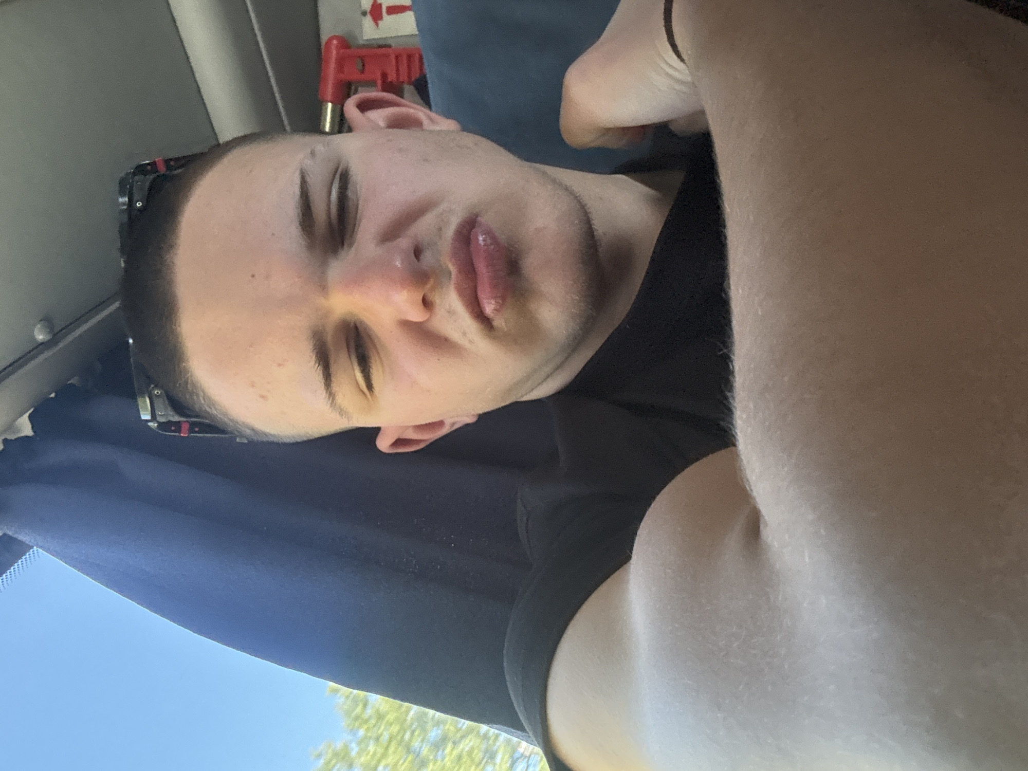 A close-up, tilted portrait of a young man with closed eyes and pursed lips, seated inside a vehicle