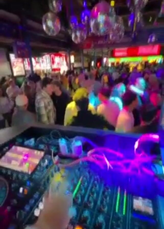 crowd of people dancing at a club. A DJ console with multiple buttons and screens is in the foreground, with a hand adjusting the settings. Overhead, there are many disco balls reflecting the lights. The crowd appears to be mixed in age, and the general atmosphere is lively. There are some signs and red and green lights around the edges of the scene, suggesting the perimeter of the club.