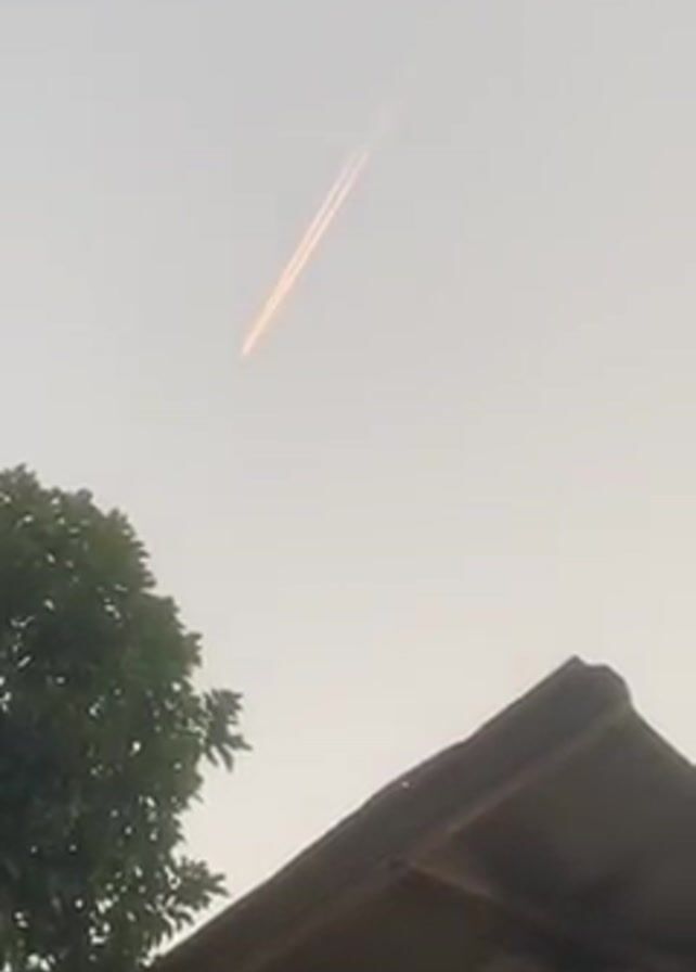 bright, thin orange trail in the sky, possibly from a plane or rocket, against a hazy light grey sky