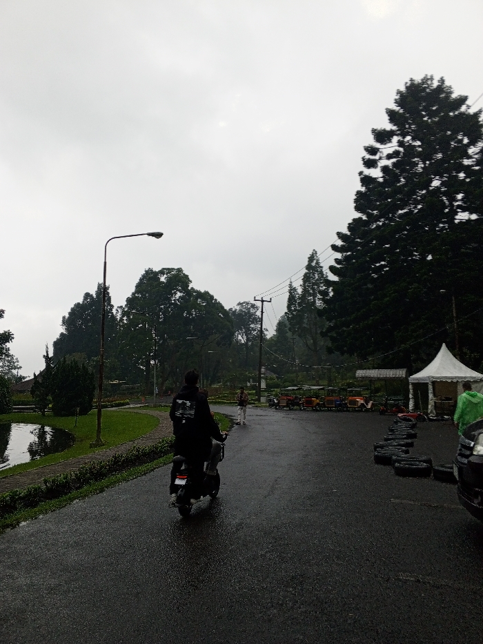 A wet asphalt road curves through a park-like setting. On the left, a pond is visible next to a grassy area. A person on a scooter drives away from the viewer, with another person standing further ahead. Go-karts are lined up near a white tent. A tall pine tree stands to the right, partially obscuring the cloudy sky. A dark vehicle is parked at the edge of the image. Power lines stretch across the scene.