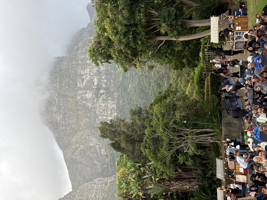 A large group of people seated outdoors, possibly watching a performance. A temporary bar is set up nearby. Lush green trees and vegetation fill the space between the audience and a massive, rocky mountain partially shrouded in mist or fog. The landscape appears to be in a location where nature and built structures are close together.