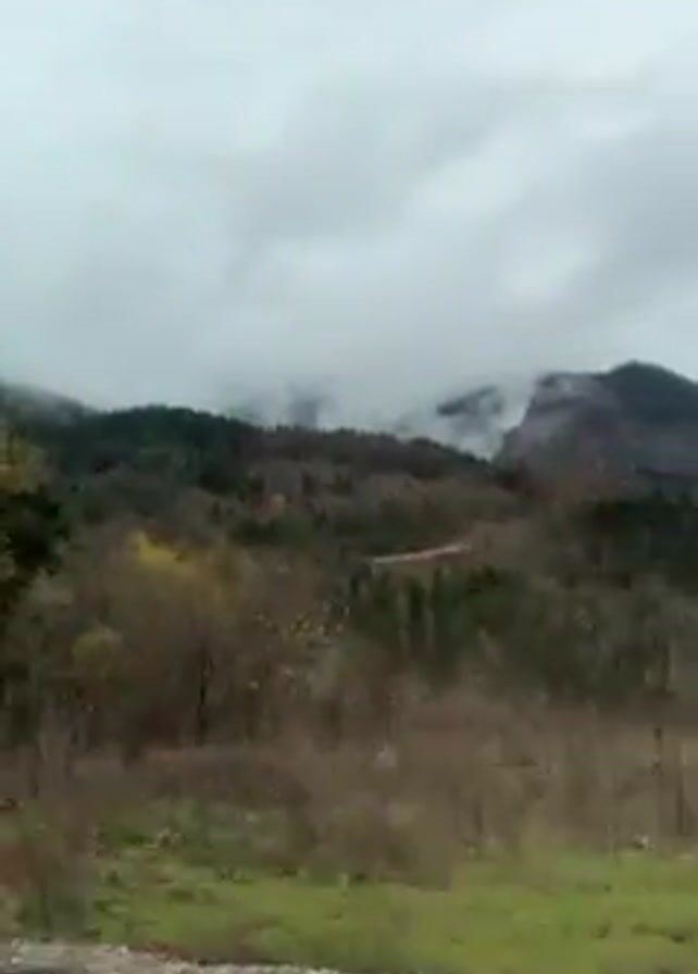 view from a moving vehicle, likely a car or bus, looking out over a landscape with rolling hills and mountains. The sky is overcast, with low-hanging clouds covering the peaks of some of the mountains. The hills are covered in trees and vegetation, mostly brown and green colors, suggesting it is late autumn or early spring. Some of the trees are bare. There is a green field in the foreground, separated from the road by a concrete barrier or wall. The camera moves, causing the view to shift and focus on different parts of the landscape. There are no people visible in the video.