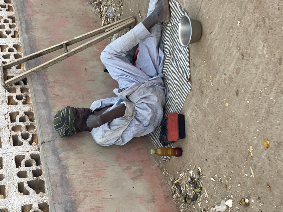 An adult male is seated on the ground in Samaru, Nigeria, leaning against a faded reddish-pink wall topped by white concrete ventilation blocks